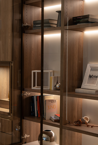 仕切りのないワイドスパン、存在感を感じさせない扉丁番、スリムな照明等により、大切なコレクションを美しく飾るためにこだわりました。