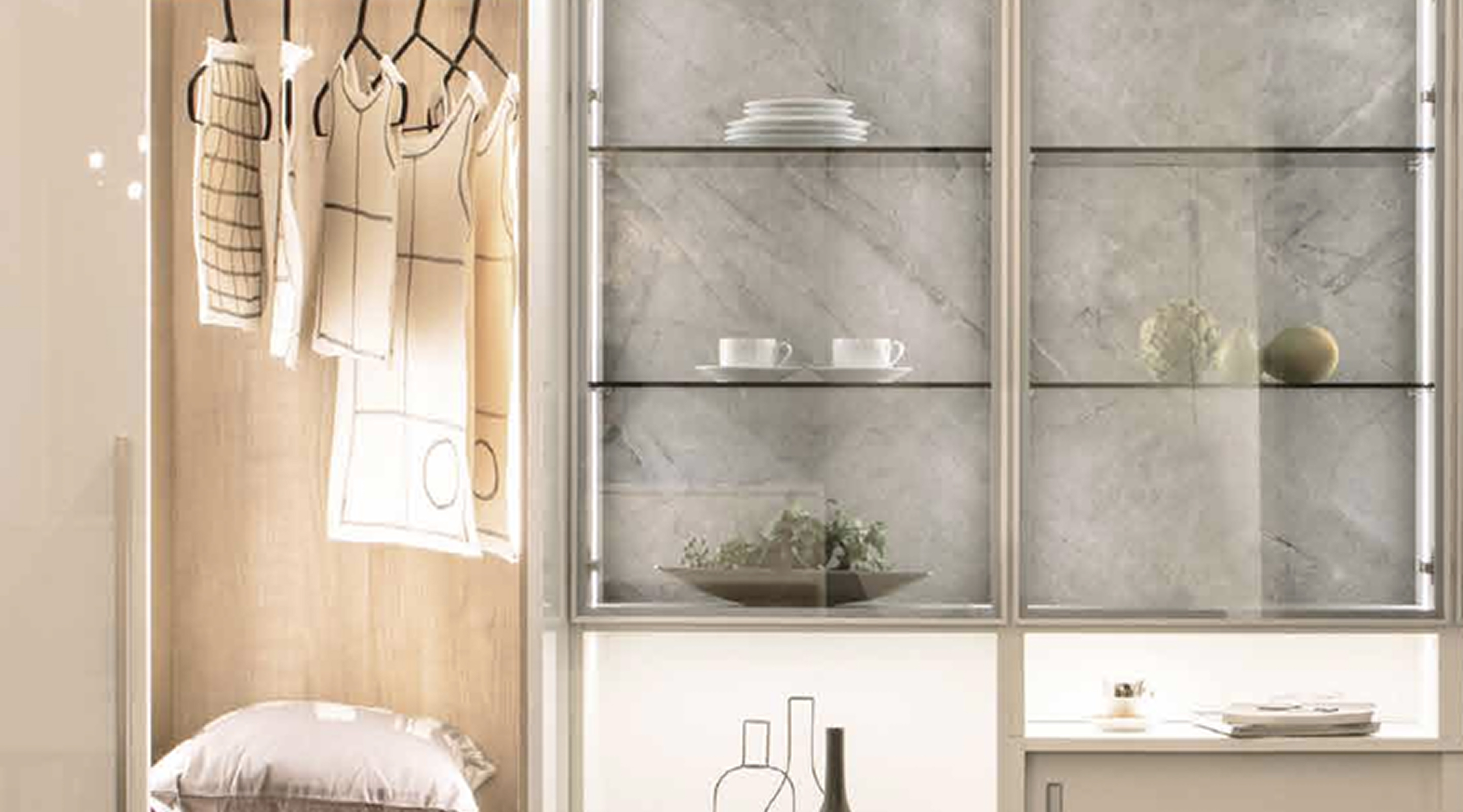 エレガントな空間を演出する床から浮かせたフロートデザインの収納。トップパネルには美しさと高機能を両立させた”Dekton”を採用しています。