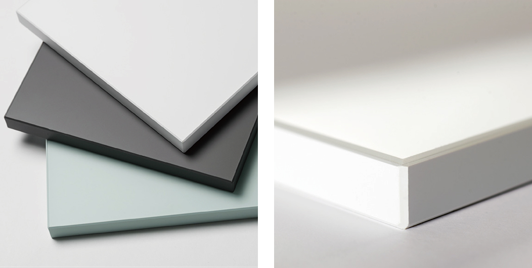 同社の60年にわたる技術を結集したハイグロス鏡面シートは、特殊技術によって非常に高い平滑性をもち、光の乱反射を抑え込んで、深みのある美しい映り込みを実現しています。