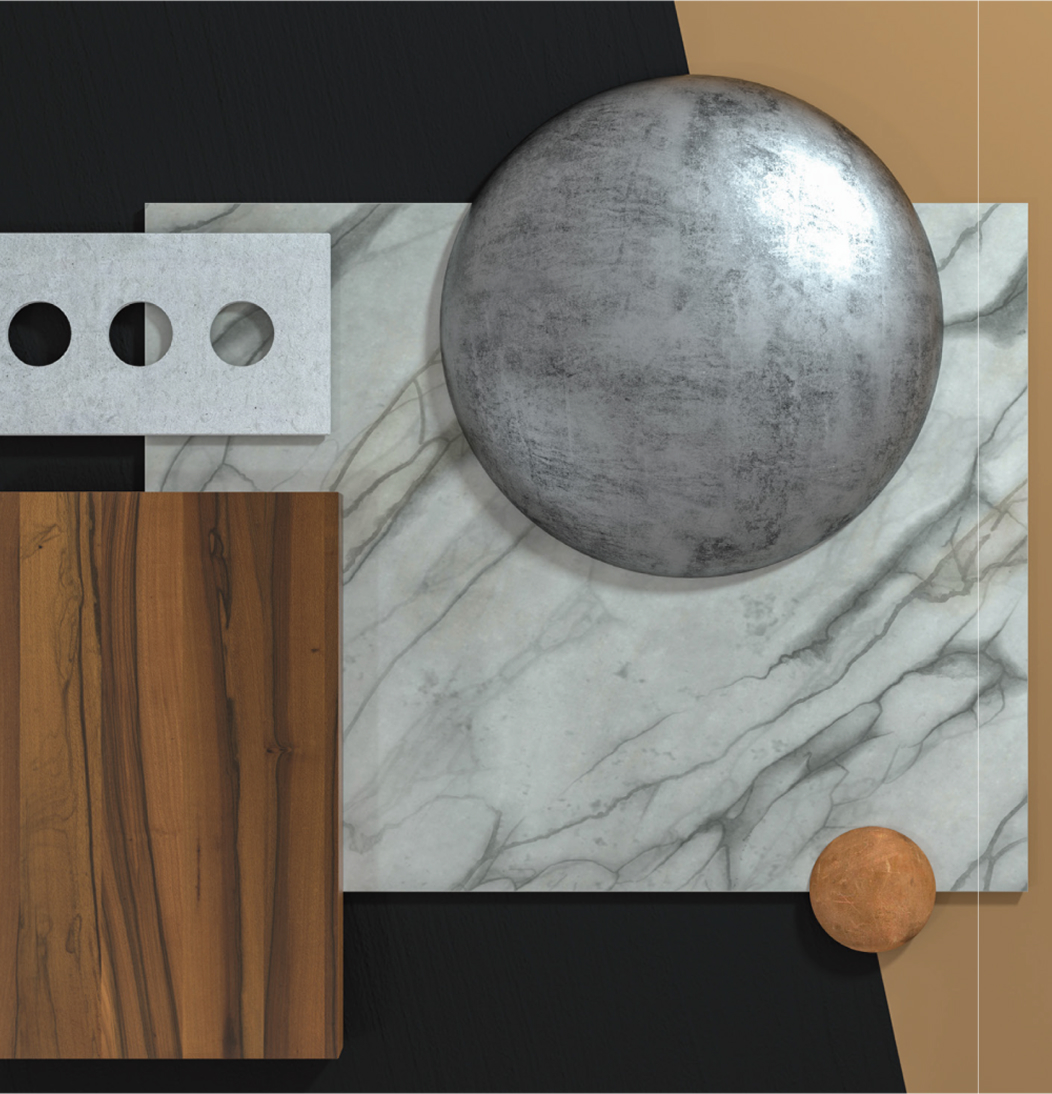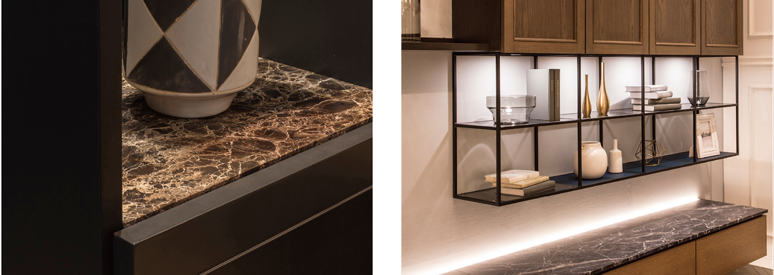 木質で構成された家具に、石やガラス、鉄などの異素材を組み合わせる。