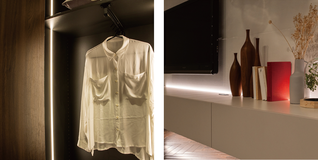クローゼットを開くと自動点灯して衣服や手元を明るくしたり、大切なコレクション、蔵書を美しく照らすオープン棚や、ヘッドボードの裏など様々な場所に取り付けられ、まるでホテルのような柔らかな間接光でやさしく照らします。