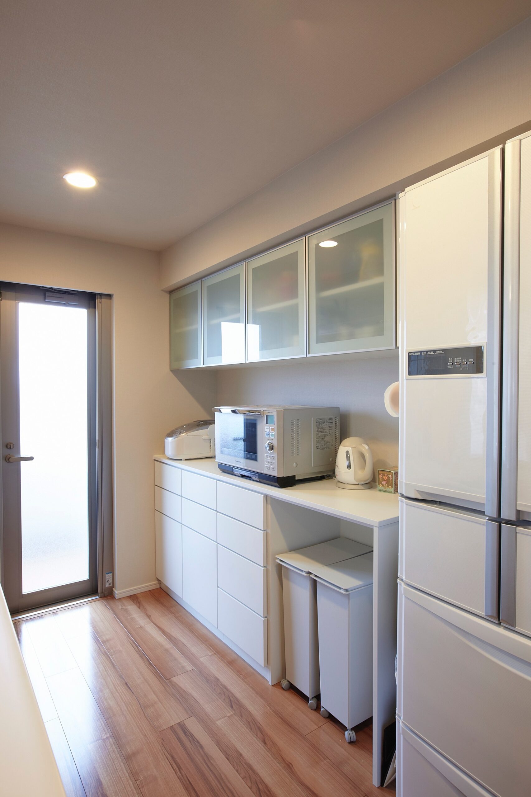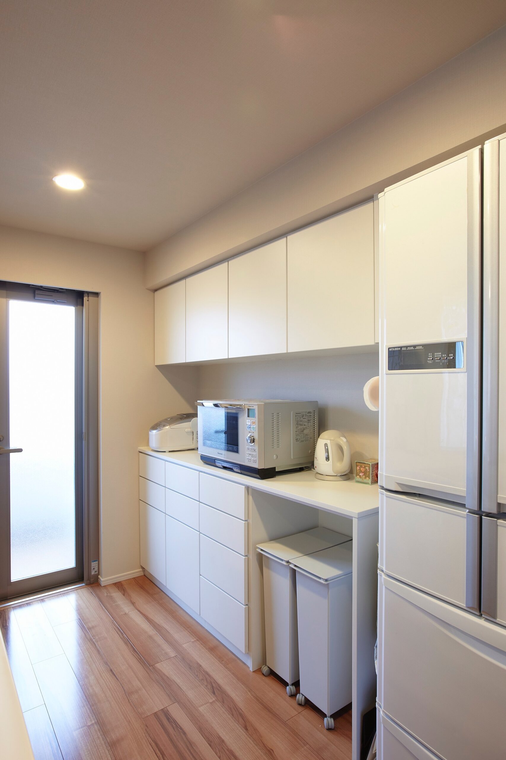 キッチンで、ゴミ箱や床に置くものをそのまま設置出来るように、底板の無いタイプのユニットです。